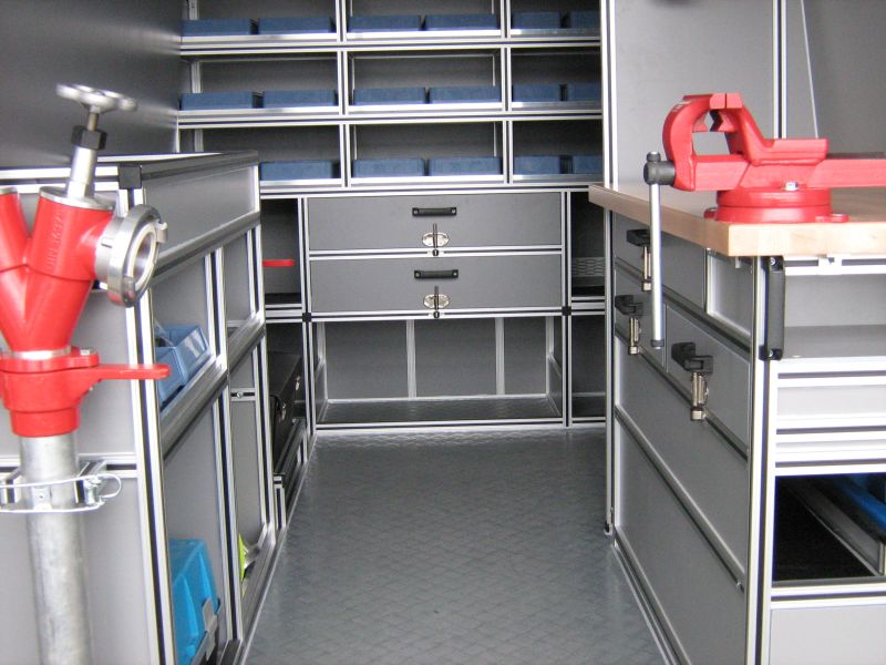 The vehicles are realized in the narrowest cooperation with the customer. Compared with customary systems we guarantee by the individual planning of every vehicle, and the application of our ingenious aluminium profile system, the most optimum exploitation of the cabin space togheter with the slightest weight of the mounted rack.